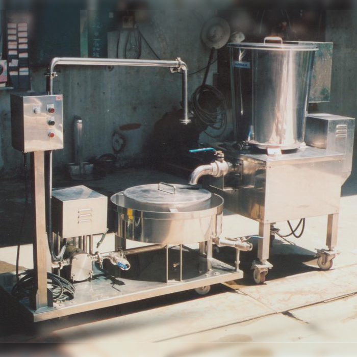 本機將攪拌機之粉漿連結管錄至此供料機作果粉機之儲備使用,高效率衛生級旋轉幫浦,可快速作清洗與維護作業